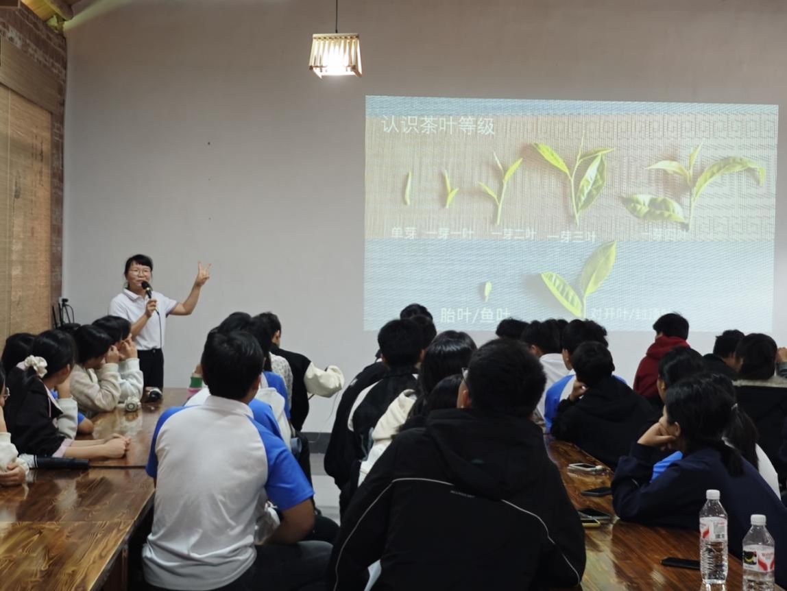 暖场环节结束后,研学活动进入理论学习阶段。华睿茶厂厂长制茶技艺传承人陈师傅,为同学们带来了一堂生动的茶文化课程。课堂上,陈师傅通过图文并茂的课件和实物展示,从茶叶的起源、种类、生长环境,讲到非遗制茶技艺的历史传承与文化价值。